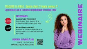 Le mercredi 4 février, l’Alliance biblique française organise un webinaire intitulé « Traduire la Bible : Quels choix ? Quels enjeux ? ».  Cet événement s’inscrit dans le contexte du lancement, il y a un an, de la révision de la Traduction œcuménique de la Bible. Existe-t-il des mots intraduisibles dans la Bible ? Sur quels manuscrits s’appuient …